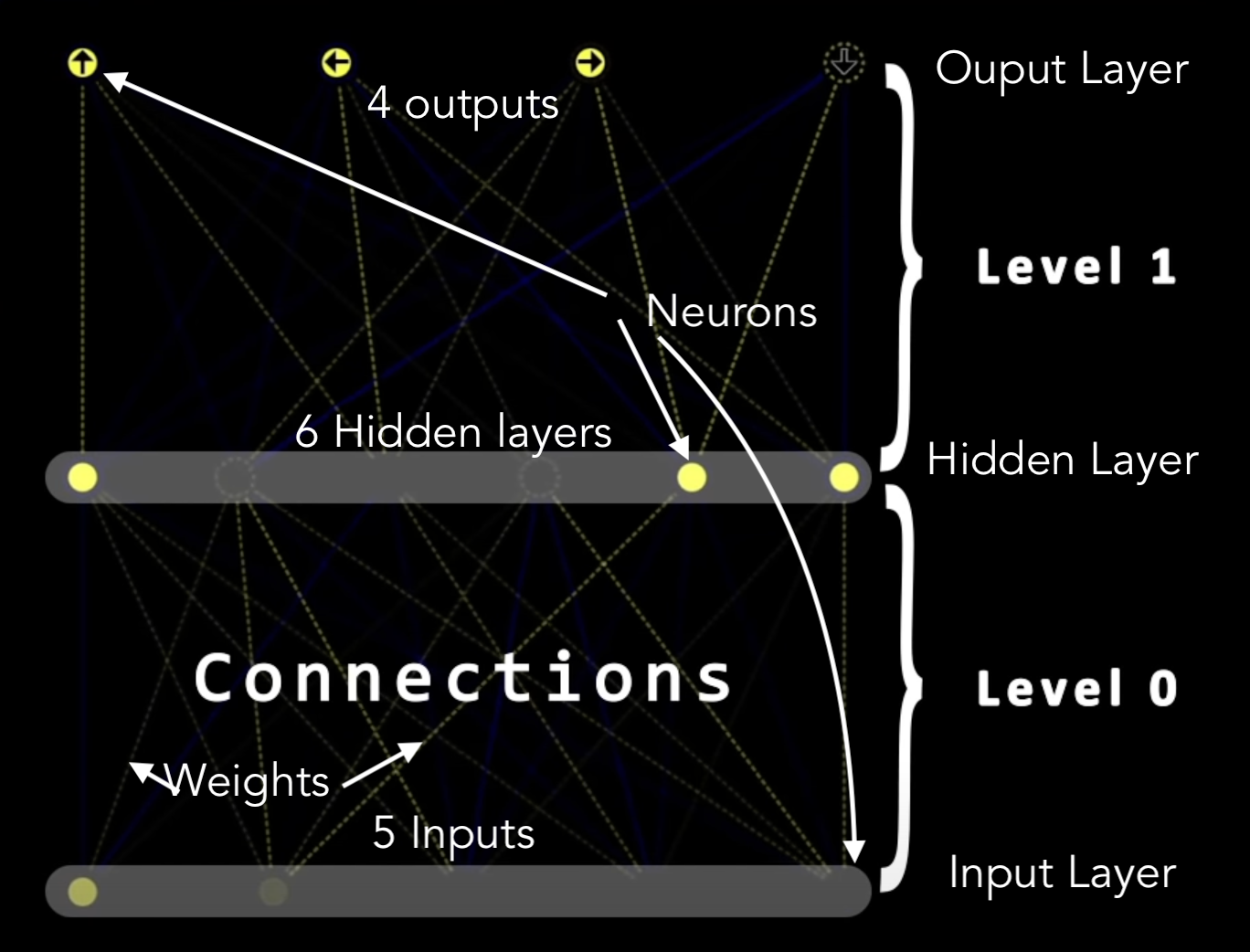 And that’s just one neuron, all the 5 inputs, connected with all the 6 neurons of hidden layer, weights and next layer, weights, and biases for first layer, and biases for second layer. Total of 64 weights and biases.