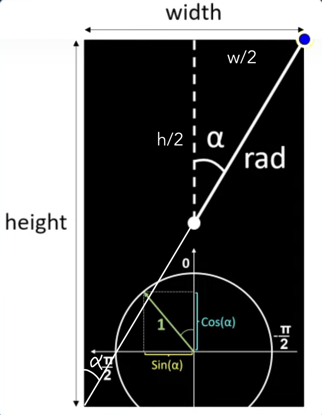 For , we take the of the difference of the angles, we know that for top right, angle decreases towards right, so if say the angle is at , we subtract alpha, to move make it negative, to move it right, and right by the angle alpha. Similarly for y, we take , of the difference the of the angles, as we know that y increases downwards, so to go up, we subtract alpha.