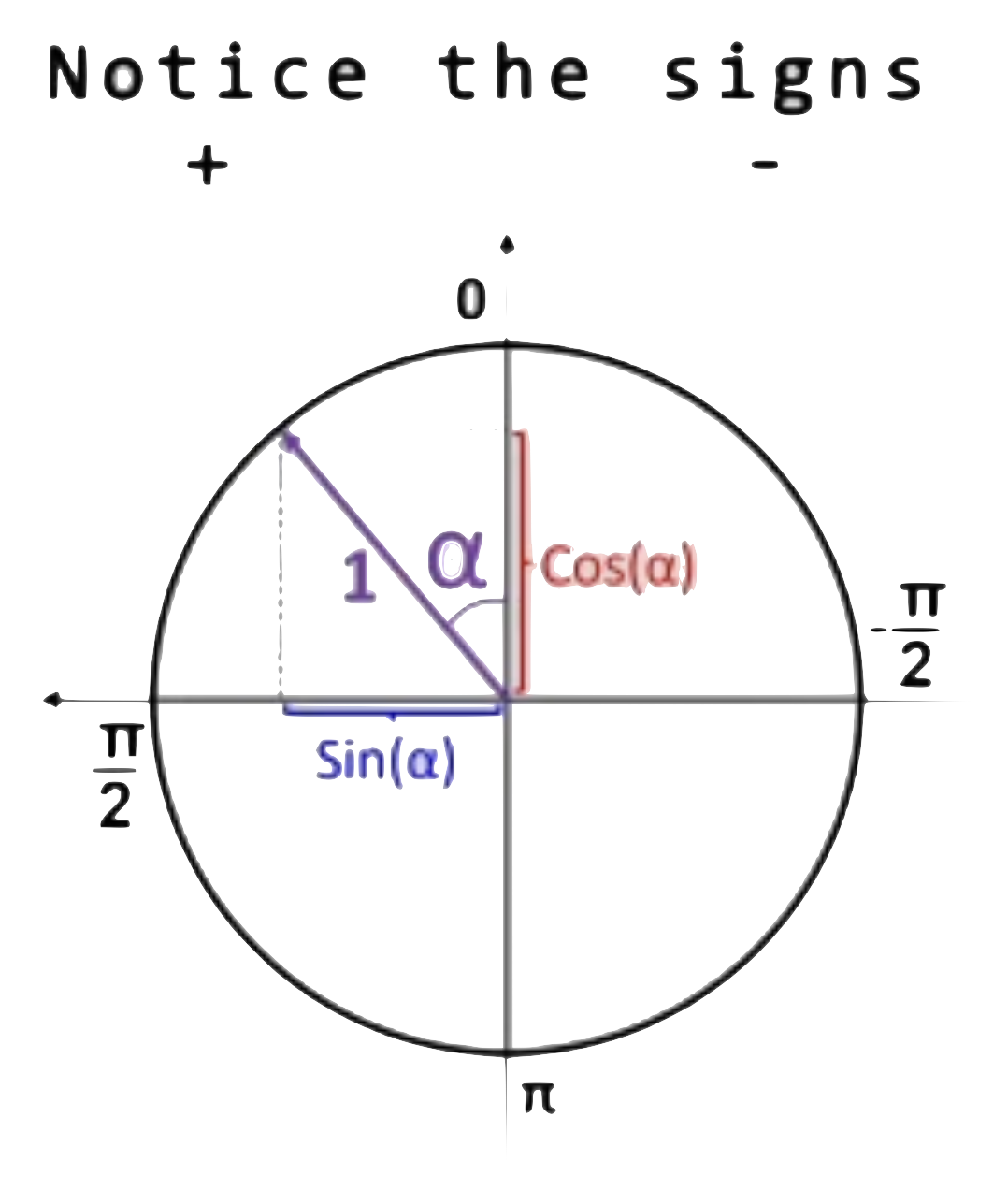 for x, looking at images, angles are positive on left sides, so subtracting from x, we can go left, and if angle becomes negative, the minus sign cancels and makes the x positive.